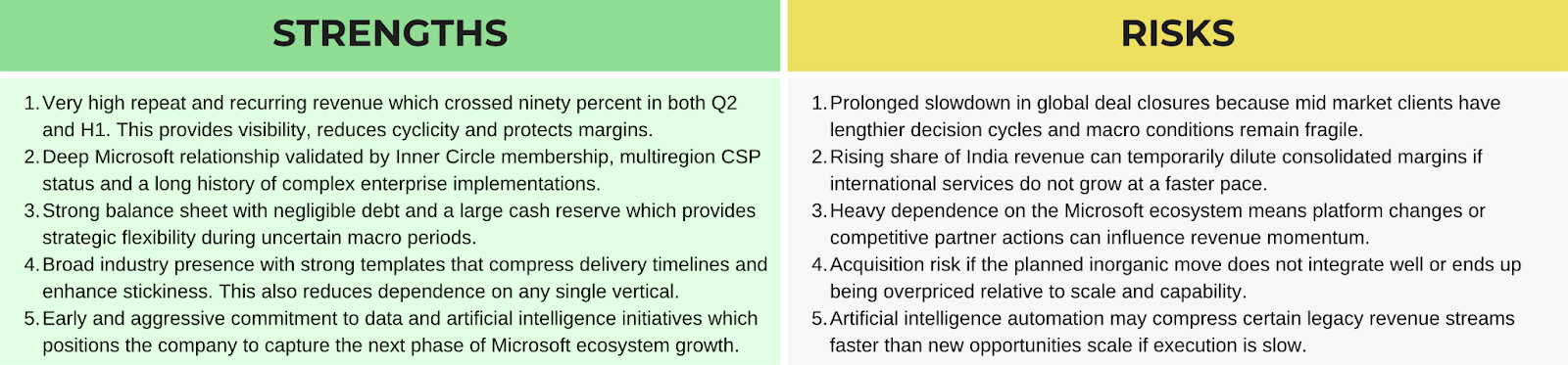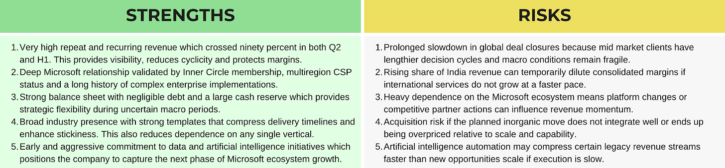 The company’s revenue engine comes from two large streams. The first is project based professional services which include design, implementation, customisation and integration of enterprise grade systems. The second is the managed and recurring annuity business that flows from continued support, cloud consumption and multi year customer relationships. More than ninety percent of revenue in Q2 and H1 came from repeat or recurring engagements which shows both customer stickiness and long term contract depth.