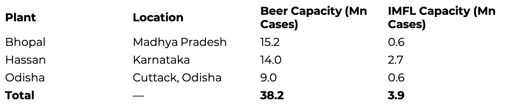Som Distilleries doesn’t follow a traditional order book model, but its strong volume growth and state-wise expansion offer solid demand visibility. In FY25, total volumes reached 245.8 lakh cases, up 9.7% YoY, with a sharp 32% dispatch growth from the Bhopal plant in April 2025. The company holds leading positions in MP, Jharkhand, and Delhi, and entered Tamil Nadu in FY25 via its Hassan plant. It expects to capture 7–8% market share in new states within 1–3 years. Backed by expanding capacity and product demand, FY26 volume growth is guided at ~18%, with 20–22% revenue growth.