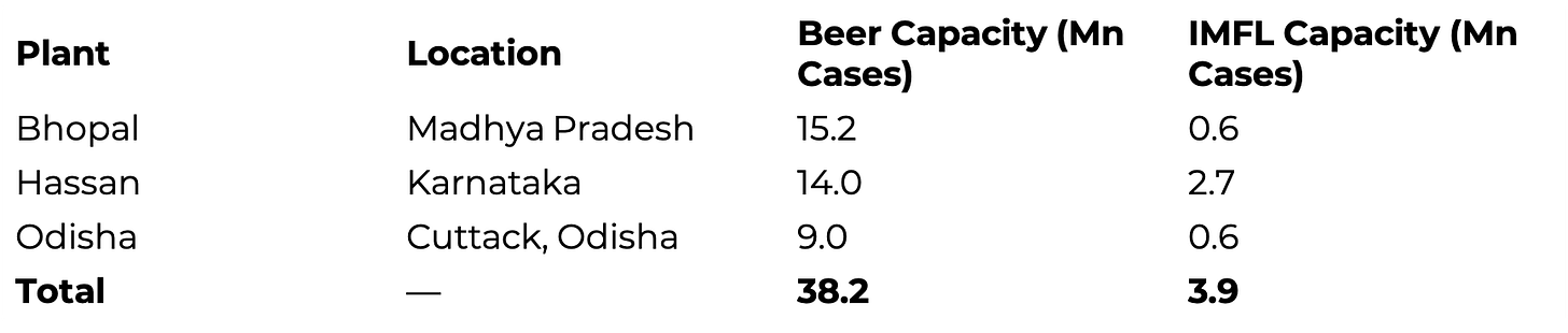 Som Distilleries is investing ₹600 crore in a phased greenfield project in Farrukhabad, Uttar Pradesh through its 100% subsidiary, Woodpecker Greenagri Nutrients. Phase 1 involves ₹350 crore, with ₹150 crore to be spent in FY26 and the rest spilling into FY27; ₹40 crore has already been spent. Phase 2 will add another ₹200–225 crore in FY27. The project will create a capacity of ~10 million beer cases annually and will be funded through internal accruals and term debt, with no equity dilution planned