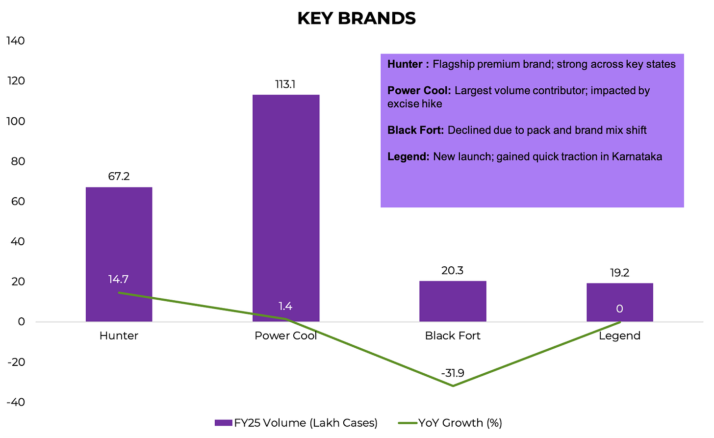 The beer segment is Som Distilleries’ core business and accounts for nearly 95% of total volumes and around 89% of revenue. In FY25, beer volumes stood at 234.4 lakh cases, registering a solid 10% year-on-year growth. The segment’s performance was led by flagship brands like Hunter, which grew 14.7% YoY, and the newly launched Legend, which quickly scaled to 19.2 lakh cases. While Power Cool faced temporary volume pressure due to excise duty hikes in Karnataka, the overall beer portfolio remained resilient. Average realization for beer during Q4 FY25 was ₹534 per case, slightly lower due to brand and pack mix shifts.