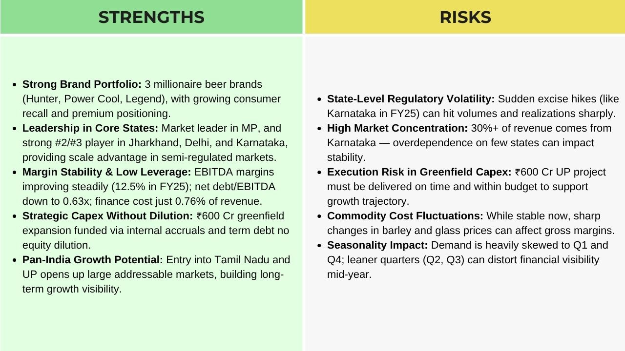 Management clarified that this was a temporary issue, and the excise duty was rolled back in May 2025. They’ve also taken price hikes in multiple states (Odisha, Karnataka, Kerala) to protect margins. Additionally, they’re focusing on improving product mix (more premium sales) and tight cost control, with gross margins remaining stable despite lower volumes.