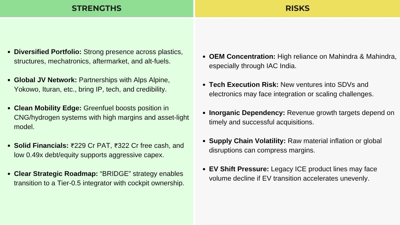 On the client side, Mahindra & Mahindra remains a key contributor, especially through IAC India’s cockpit and panel business. However, the company services a wide base including Maruti Suzuki, Tata Motors, Honda, Bajaj, Daimler, and Skoda VW. With strategic efforts underway to deepen engagement with Tata and Maruti, along with growth in aftermarket and alt-fuels, client concentration risk is gradually being diluted.