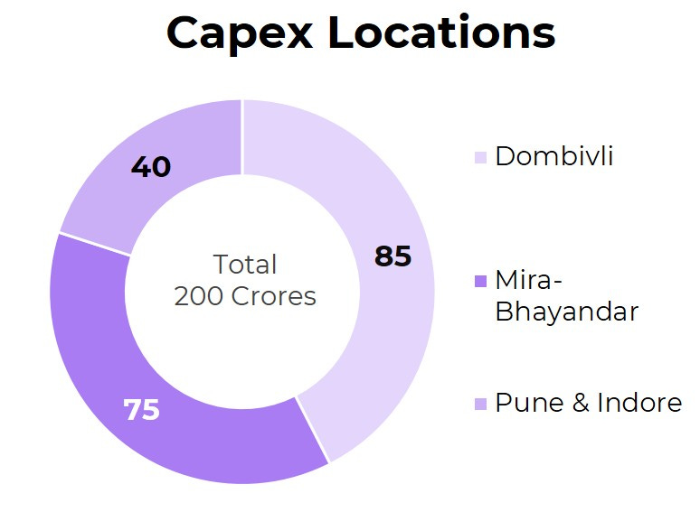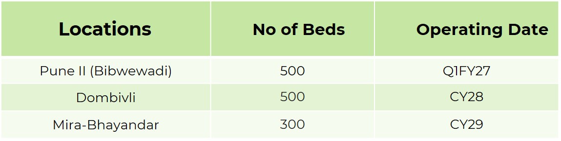 The 500-bed Dombivli hospital is expected to launch as planned in Q1FY27. The second Pune hospital, also with 500 beds, has received all building permissions and environmental clearances. Excavation work has commenced, and construction is expected to begin after the monsoon this year. Dombivli Hospital incurred a capital expenditure of ₹85 cr in FY25. Total expenditure to date, including land acquisition ₹165 cr.