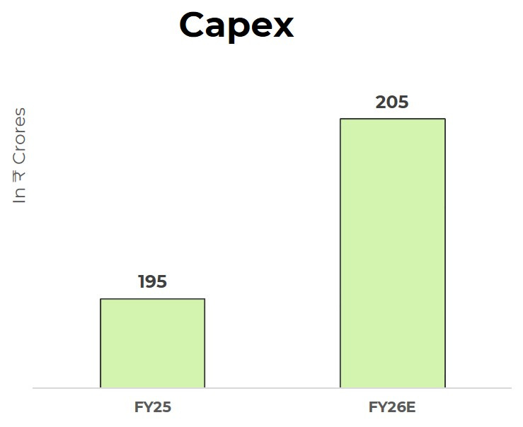 In Q4 FY25, Time Technoplast disclosed a total capex upto ₹200 crore for FY26. About ₹80-85 crore, reengineering, automation for established products of the annual spend is slated for brownfield expansion enhancing capacities in composite and ₹122 crore for value-added products (IBC tanks, composite cylinders , new products CNG, LPG development product)