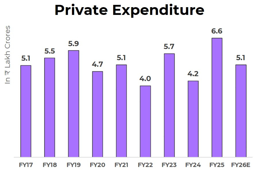 Private capex refers to investments undertaken by companies or private entities in creating or expanding physical assets such as manufacturing plants, machinery, data centers, warehouses, and infrastructure. It reflects confidence in demand outlook and typically leads to long-term productivity, employment generation, and economic growth.