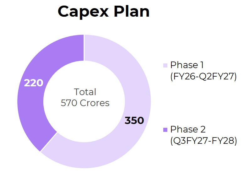 Phase 1 required ₹350 crore capex and Phase 2 will require ₹200–225 crore (expected in FY27).