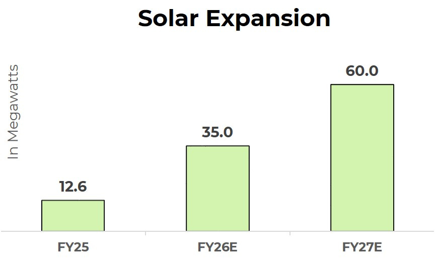 Expansion of renewable energy capacity (solar and wind): I think the quick answer is solar power plant, we have got a benefit of about ₹40 crores last year. This year, we expect it to give us benefit of total ₹80 crores. So another ₹40 crores more in this year. Company is looking for 12.6 megawatt of wind and it produces at least double of solar and 35 megawatts of solar. For FY27 could be another 50 to 60 megawatts of solar. It also depends on government policies.