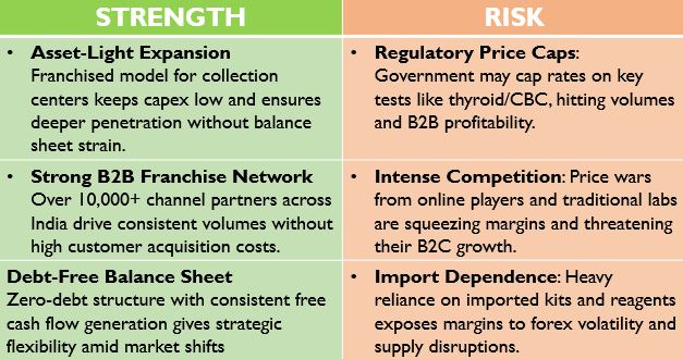 Strategic Acquisitions: In FY25, Thyrocare acquired Polo Labs in July 2024 and the clinical diagnostics division of Vimta Labs in October 2024, enhancing its presence in North and South India and supporting broader test offerings.