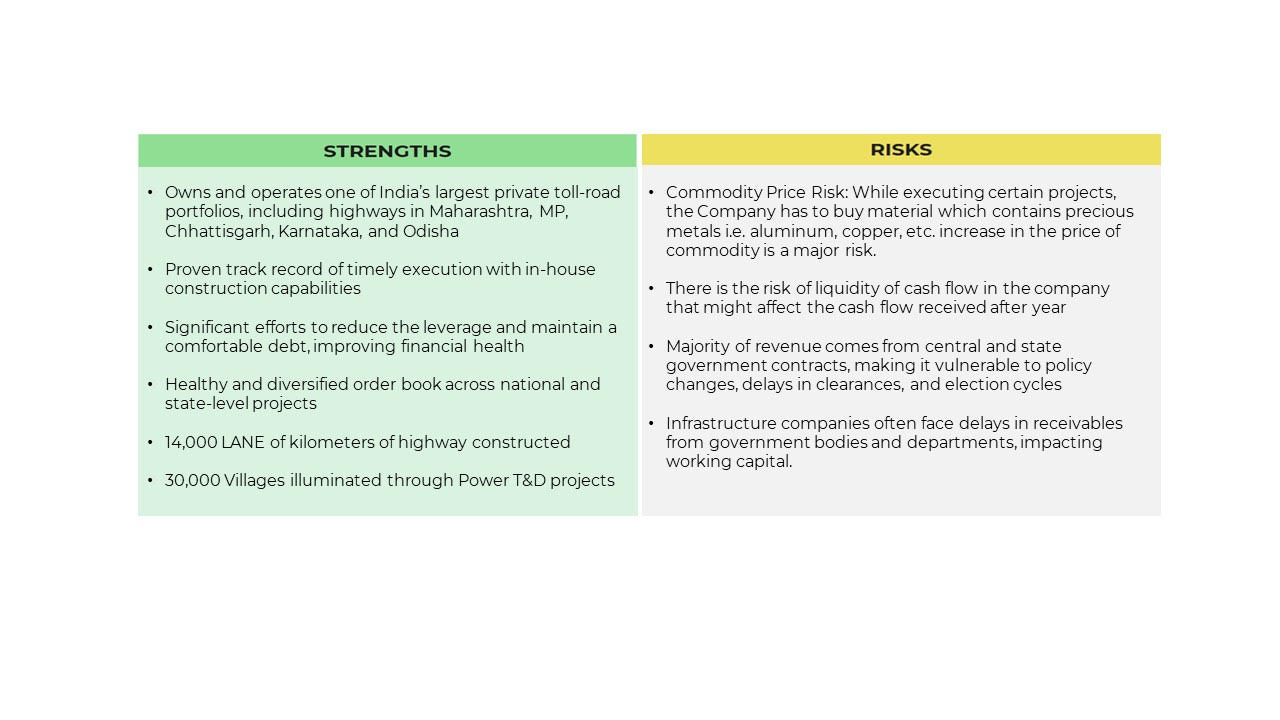 The company was one of the first to enter the BOT road sector in India, winning its first project in 1997. The company has 21 BOT/HAM road projects, including 13 projects (6 BOT toll and 7 HAM projects). Overall, the group has 11 HAM projects, 10 of which are already operational or have received provisional completion. It also has 4 BOT annuity projects and 6 BOT toll projects.