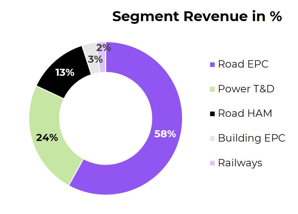 The company undertakes engineering, procurement, and construction (EPC) of road, rail, power projects, etc. The company has constructed 14,000+ lane km of highways and electrified 30,000+ villages through power Transmission & Distribution projects. Additionally, it has completed 750+ kms of overhead electrification, linked 170+ kms of railway tracks, laid 32,000 km of optical fiber, and built 10+ Mn sq. ft. of buildings.