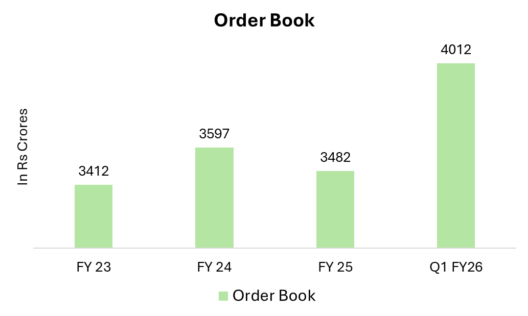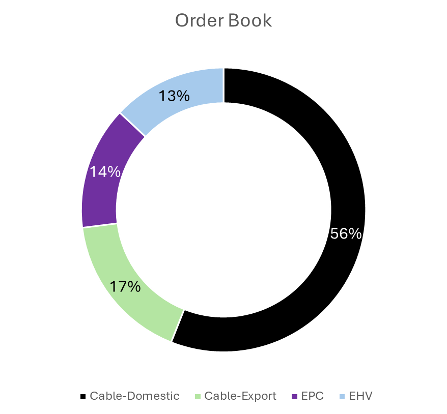 As of 30th June 2025, KEI Industries maintained a healthy order book of ₹3,921 crore. The Wire and Cable segment formed the bulk of this, contributing ₹3,381 crore, with ₹2,140 crore coming from domestic cables and ₹538 crore from extra-high voltage (EHV) cables. The remaining ₹540 crore comprised pending EPC orders, reflecting steady demand across both manufacturing and turnkey project segments.