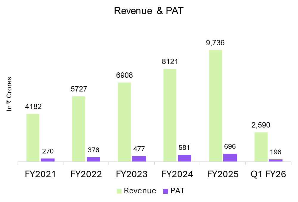 Exports grew sharply to ₹373 crore in Q1 FY26, up from ₹1,267 crore in FY25.