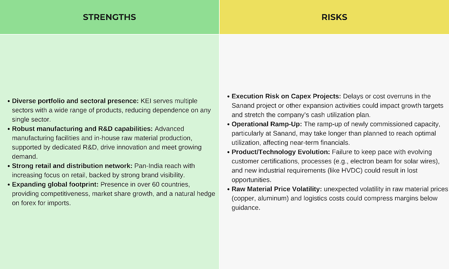 KEI continues to invest in R&D and product innovation to align with emerging opportunities. It recently commenced supplies of ESP cables for global oilfield markets, becoming the only Indian player in this space, and is preparing to launch HVDC cables from Sanand. Other developments include EV charging solutions, medium-voltage current-carrying cables, and e-beam technology for railways and shipbuilding applications.