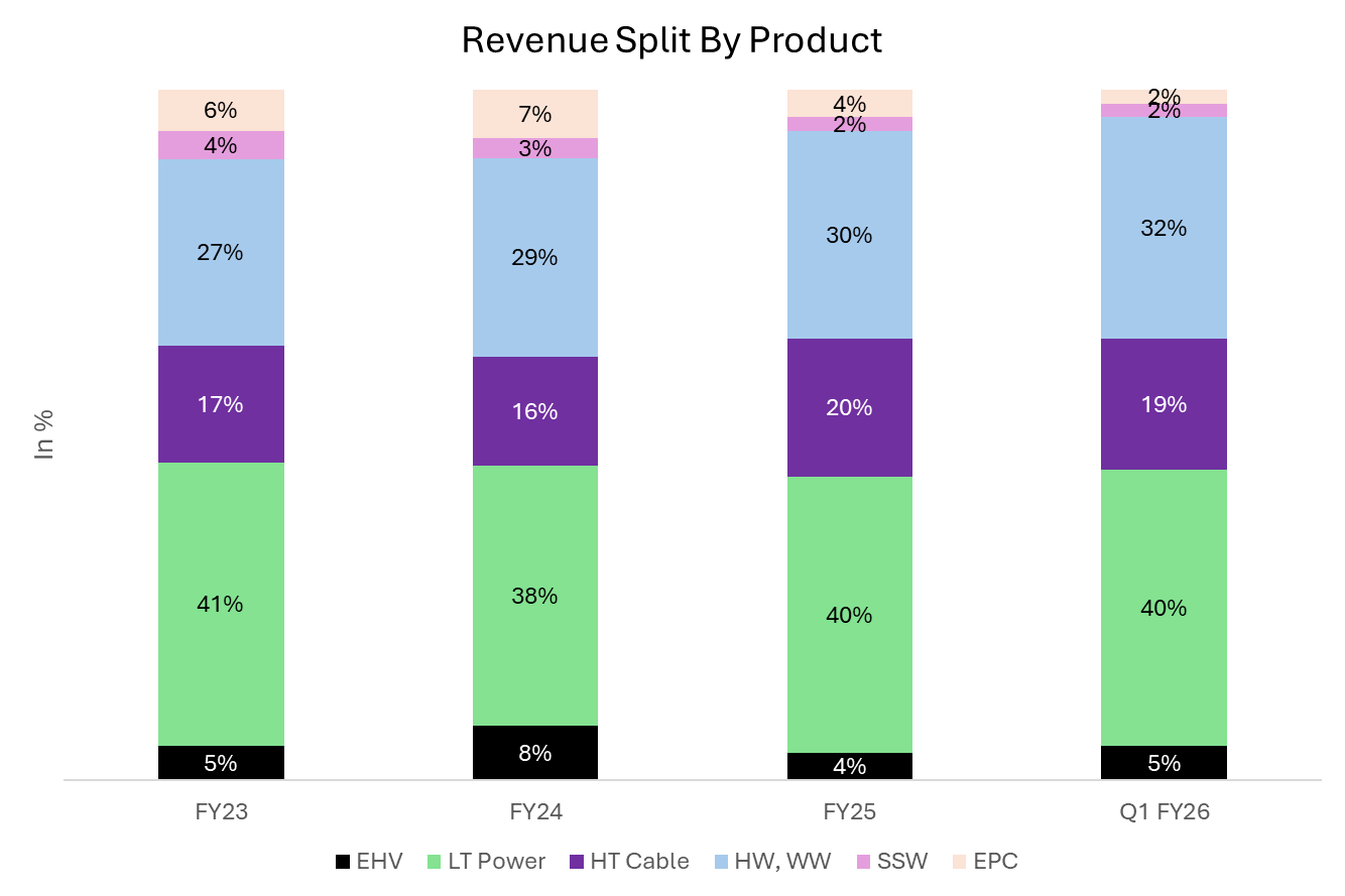 KEI’s core revenue comes from LT Power cables, contributing around 40% and remaining stable. The HW/WW segment is steadily growing, reflecting strong retail and urban demand. Smaller segments like EHV, SSW, and EPC contribute a minor portion of revenue.