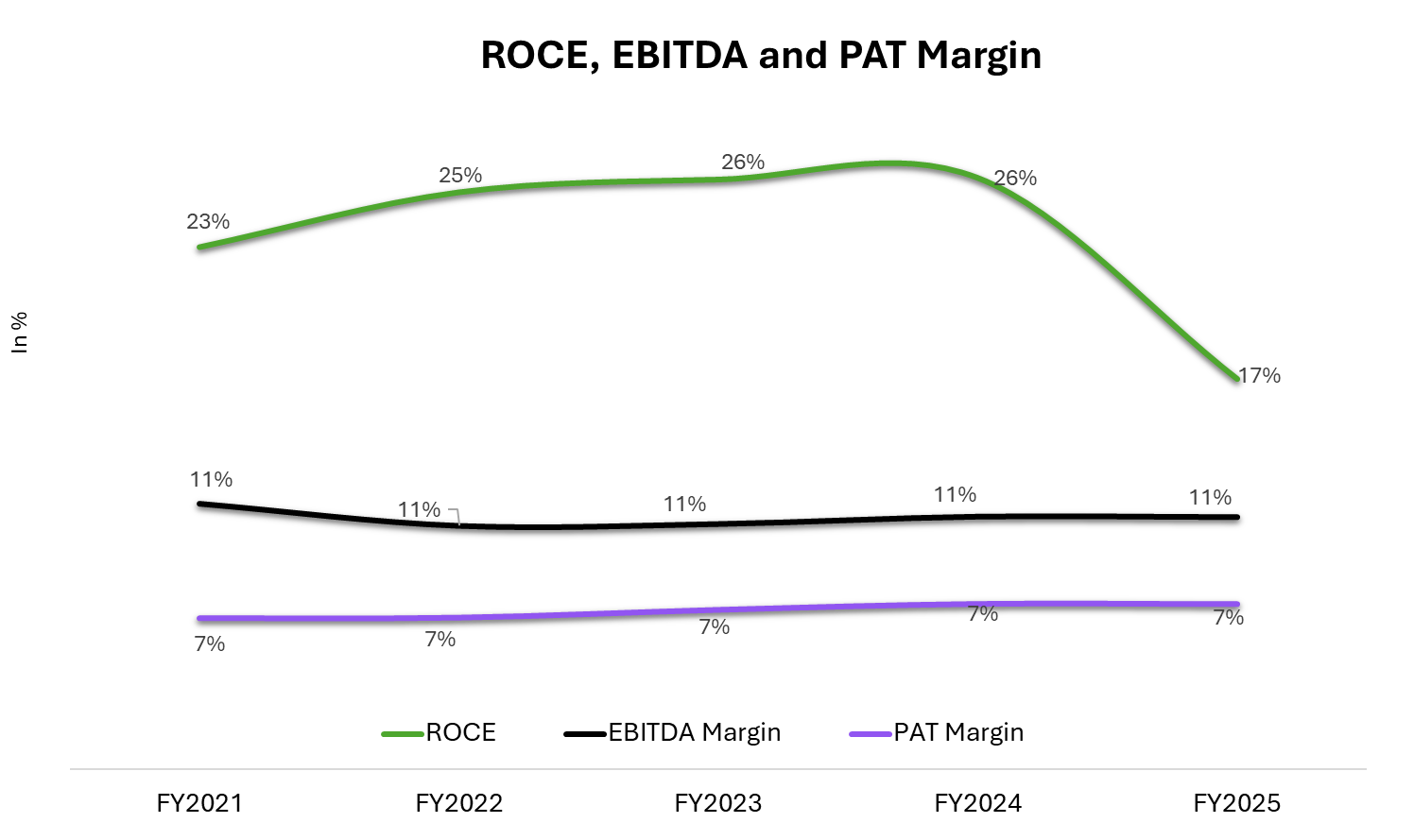 Management is targeting 18–19% revenue growth in FY26, accelerating to 20% CAGR over the next 2–3 years as Sanand ramps up. Margins are expected to gradually improve as the business mix tilts toward high-margin retail, exports, and EHV, while lower-margin EPC is scaled down.