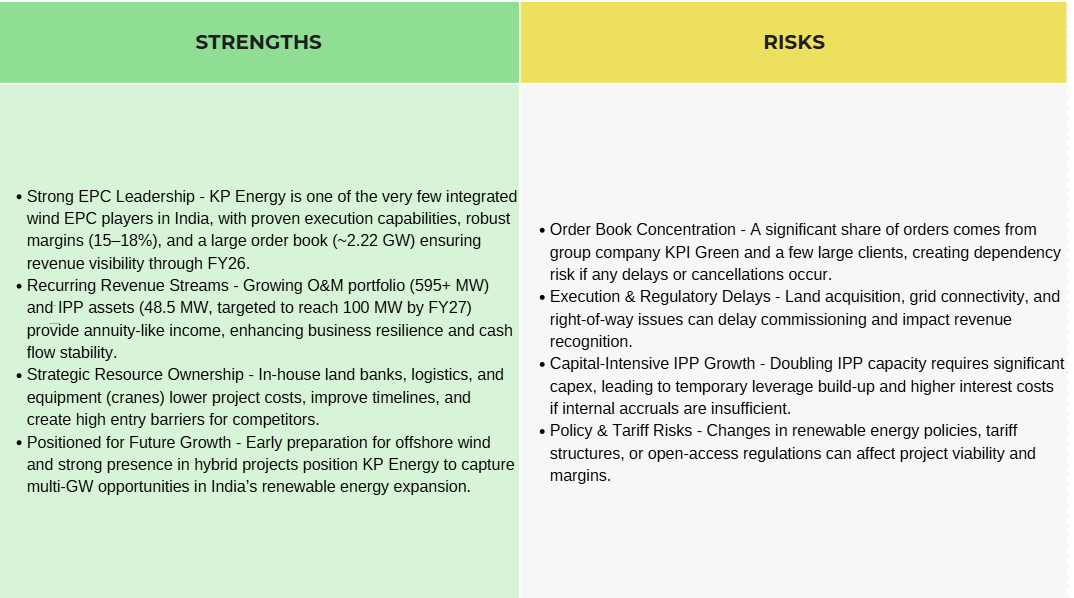 IPP assets deliver robust PLFs (wind: 35–37%, solar: 20–23%) and healthy realizations (₹4.5–5/unit net for wind, ₹5–5.5/unit for solar), strengthening earnings visibility and complementing EPC revenues. This segment underscores KP Energy’s commitment to sustainability and enhances overall business resilience.
